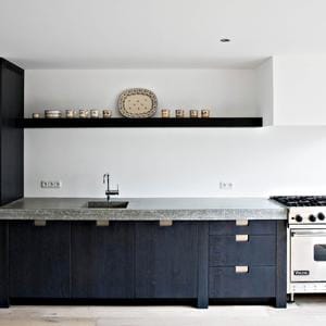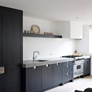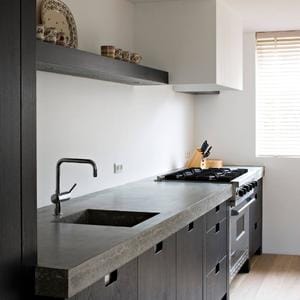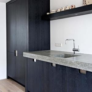 ‘Eenvoud troef’… Zou u gerust kunnen zeggen over dit zwarte pareltje. Maximale bergruimte, heel overzichtelijk. Dit is simpelweg een hele fijne keuken. Rechts naast het kookgedeelte is een aanzienlijke ruimte vrijgelaten. Dit is heel prettig in gebruik. Ik moet u in de eerlijkheid bekennen dat deze foto’s gemaakt zijn vlak nadat ik klaar was met het (linker)keukenblad. De gezellige gebruikselementen; een kommetje een fruitschaal of een prachtig koffieapparaat konden de keuken nog niet sieren. Maar met een beetje fantasie kunt u die er wel bij denken.Naar overzicht